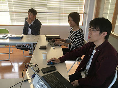 画面を見ながら開発の打ち合わせをしている様子